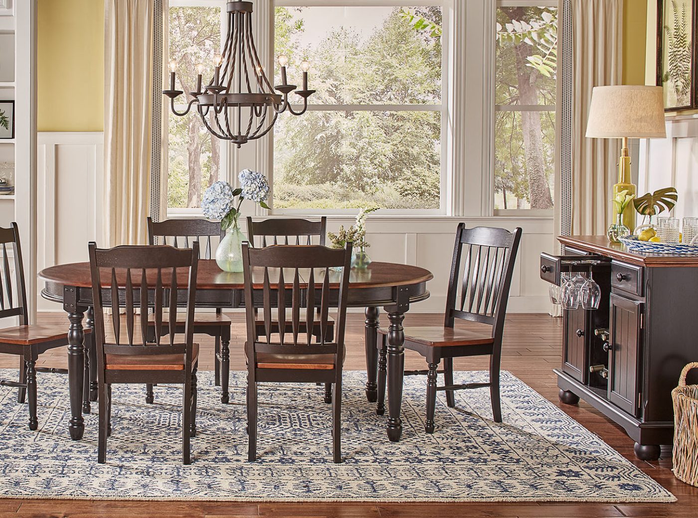The solid hardwood British Isles collection is designed to appeal to those who want a traditional and country style at a great value. This two tone Oak & Black finish is a nice updated look that compliments itself to many homes and styles. This collection features 2 chair styles, turned legs, 4 tables options, self-storing leaves to extend table space, and a server that includes a wine & stemware rack.
