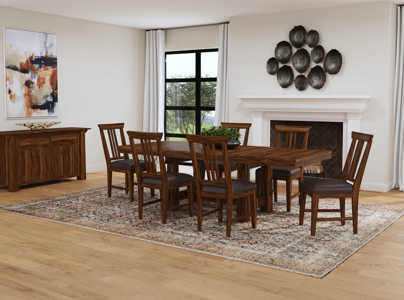 The Mission style receives a modern update in the Cortez Dining collection. Classic slanted lines exemplify the motif, with thick legs and angled braces that embrace this style of furniture. Design details include channeling along the legs and decorative corbel supports on the table and server. A rich Saddle Brown finish accentuates the beauty of the solid mahogany wood and is beautifully paired with matte black hardware. There are plenty of storage options found in the server, with soft close drawers and doors.Â