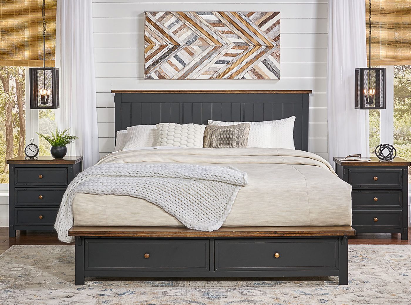 Stormy Ridge invites warm hospitality to the bedroom with its practical farmhouse style and generous footboard storage option. Simple elegance is achieved with classic moldings and coordinated wood hardware. Pronounced distressing in the chicory finish mimics the look of time-worn wood that is contrasted by the soft slate black paint recalling faint chalky memories of a by-gone era.