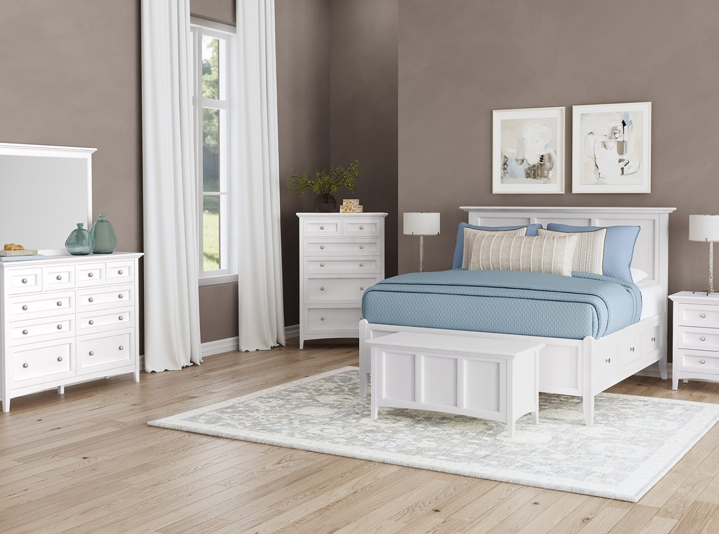 The Westlake White Bedroom Collection blends modern simplicity with classic Shaker craftsmanship, offering a timeless aesthetic in a crisp, fresh white finish. Crafted from solid mahogany, this collection embodies both elegance and durability, with clean lines and subtle panel details that evoke a sense of refined serenity. The storage bed is a perfect marriage of style and functionality, featuring spacious side drawers for additional organization, making it an ideal solution for smaller spaces. Designed with practicality in mind, each piece features dovetail drawer boxes and ball bearing glides for effortless access. Whether furnishing a cozy retreat or a spacious master suite, Westlake White offers enduring quality and modern charm to elevate any bedroom setting.The Westlake White Bedroom Collection blends modern simplicity with classic Shaker craftsmanship, offering a timeless aesthetic in a crisp, fresh white finish. Crafted from solid mahogany, this collection embodies both elegance and durability, with clean lines and subtle panel details that evoke a sense of refined serenity. The storage bed is a perfect marriage of style and functionality, featuring spacious side drawers for additional organization, making it an ideal solution for smaller spaces. Designed with practicality in mind, each piece features dovetail drawer boxes and ball bearing glides for effortless access. Whether furnishing a cozy retreat or a spacious master suite, Westlake White offers enduring quality and modern charm to elevate any bedroom setting.
